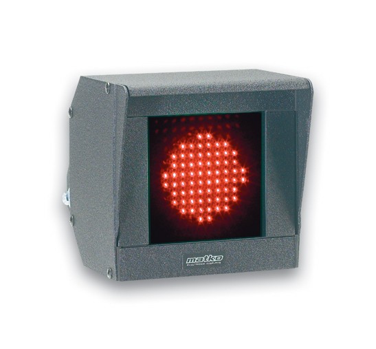 The SG is designed outdoor industrial environments with a recommended viewing distance between 20 and 100 feet and a maximum recommended distance of 150 feet. Typical applications include traffic control and loading indicators. The unit can be controlled via a closed contact switch, 1 or 2 TTL levels, a data stream, or can be setup as a truck dock light. When set as a truck dock light, simply connect two 12 volt photo sensors and the green light is on when no sensors are tripped, red when one is tripped and flashes red when both are tripped. the flashing speed is field selectable. Optionally, a remote control can toggle between the two colors or flash one color and return to the other. This unit comes with a visor and a mounting bracket that can be used on both a wall and a pole.